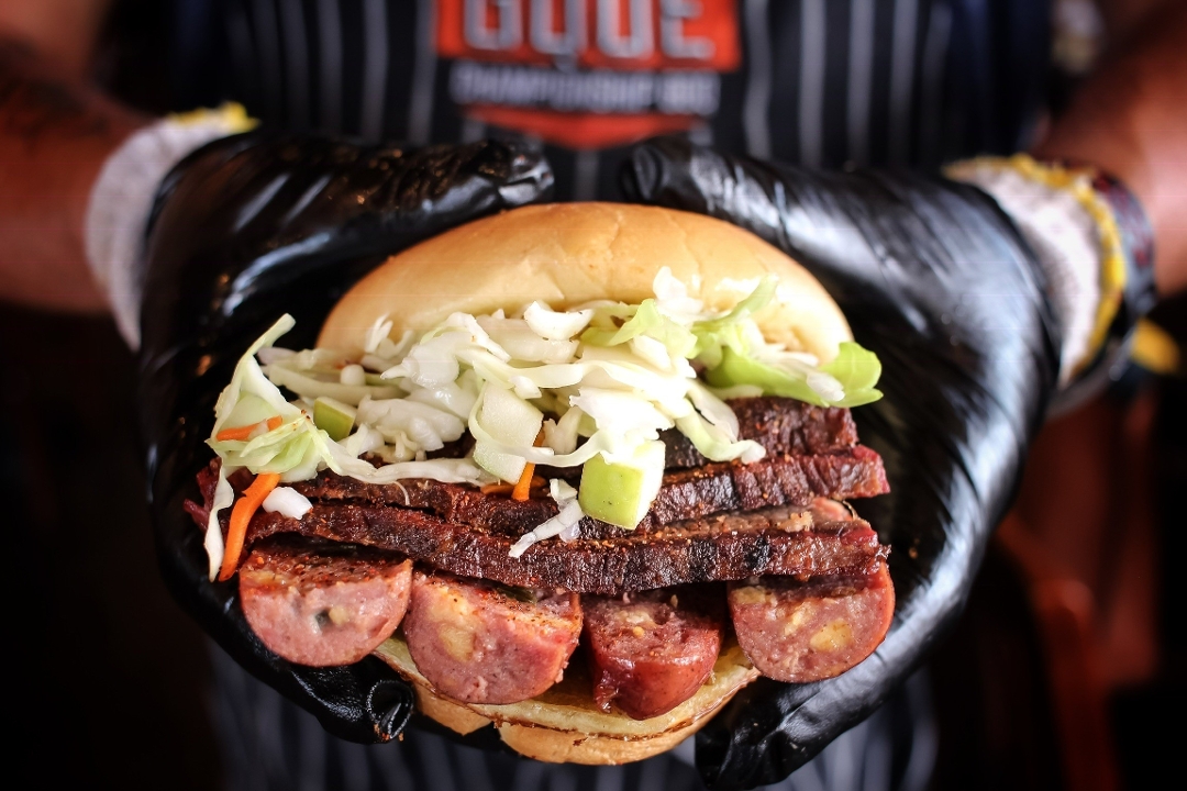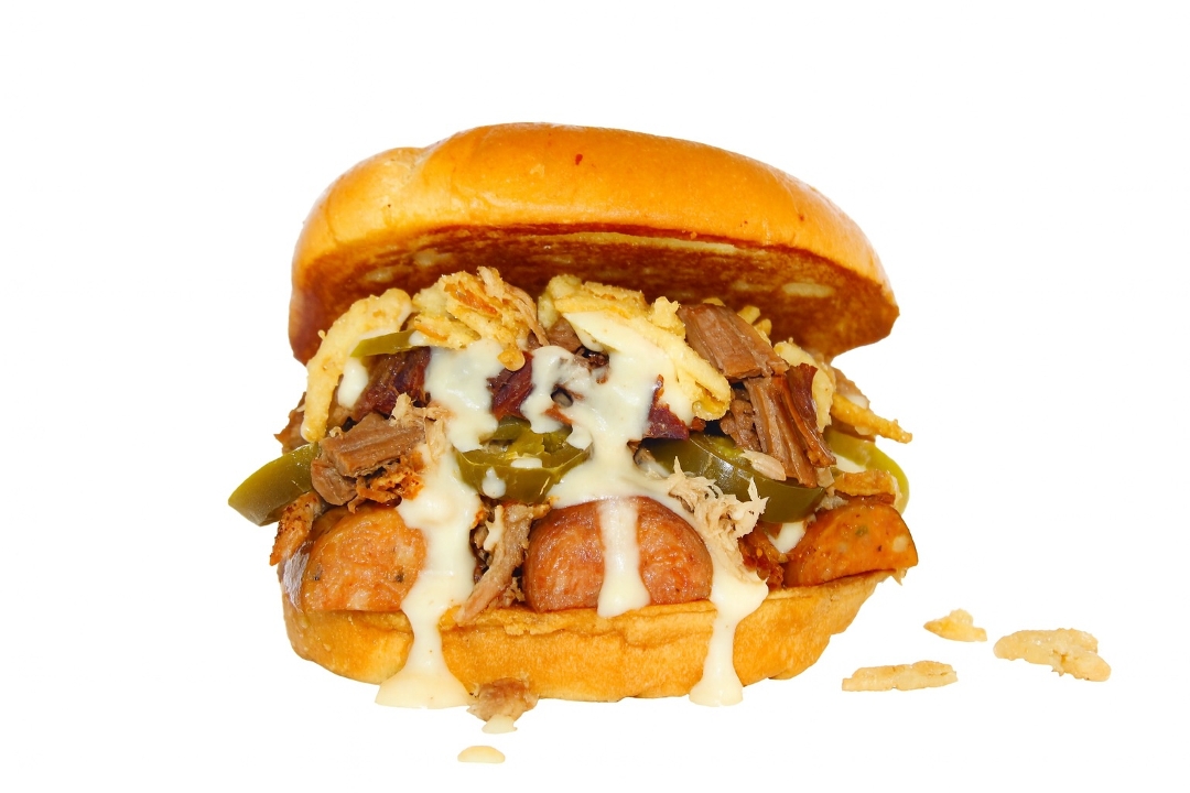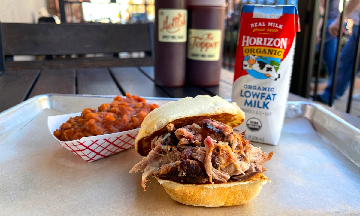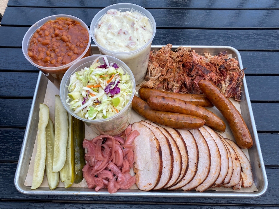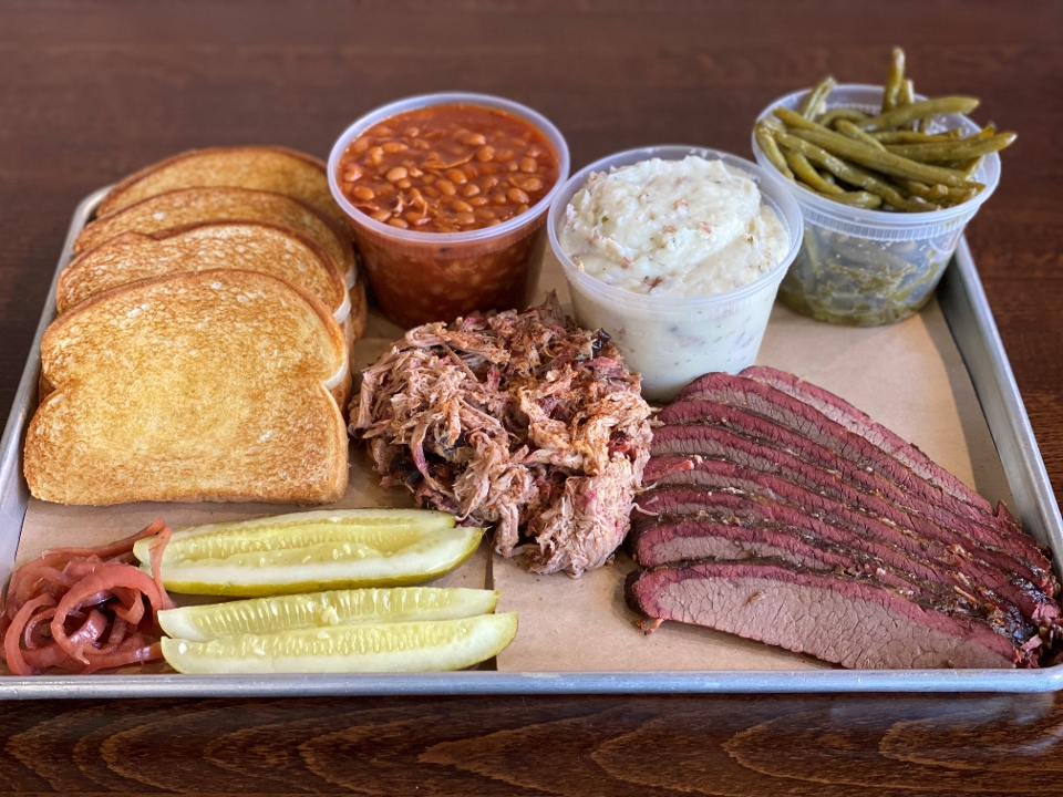 Serves a family of 4-5. Includes: 1 1/2lbs. of meat (12oz. of each of the 2 meats) with 3 Pints of sides. Toast, Pickles and Onions are optional.