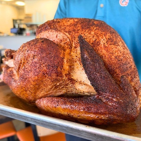 FOR PICK UP ON TUESDAY 11/25 OR WEDNESDAY 11/26 ONLY! Please select the correct date when ordering and choose the time you think you will pick up. This is for a 12-14lb. whole smoked turkey that will be fully cooked, cooled down and ready to re-heat for your Thanksgiving Dinner.