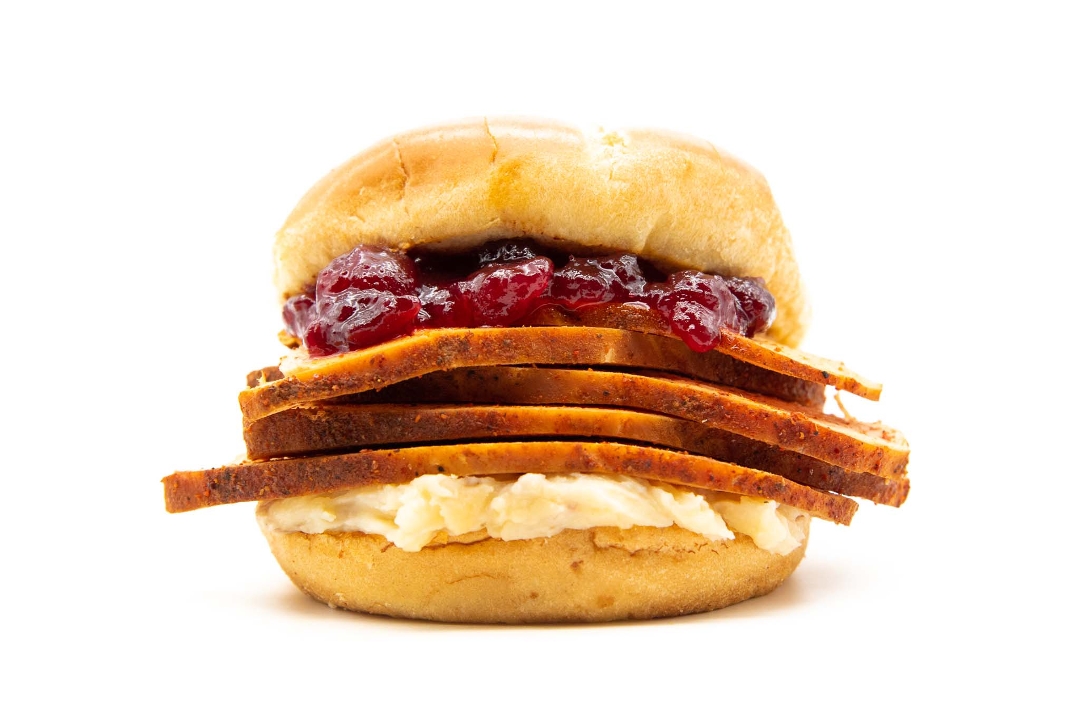 Sliced Turkey sandwich served with mashed potatoes and cranberry relish.